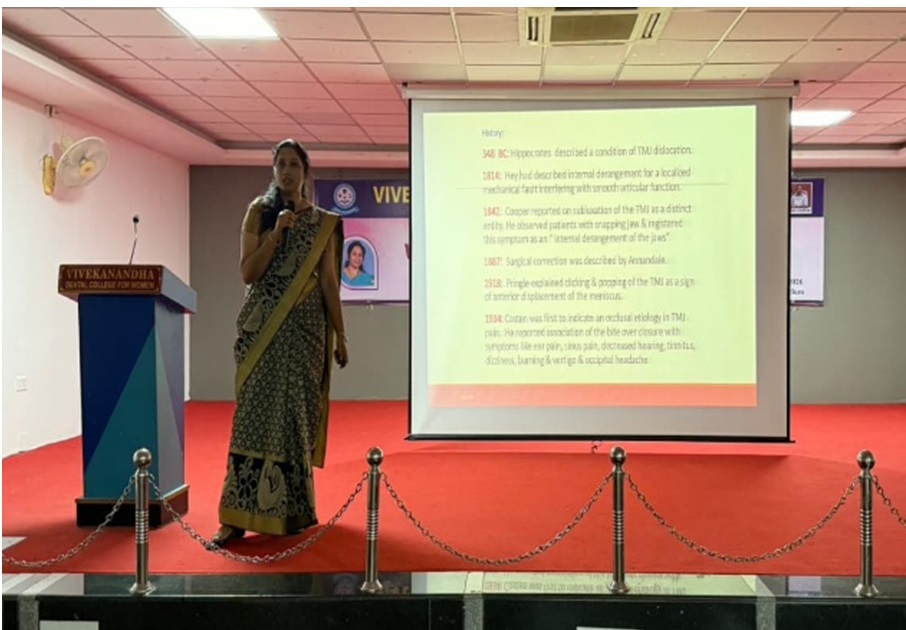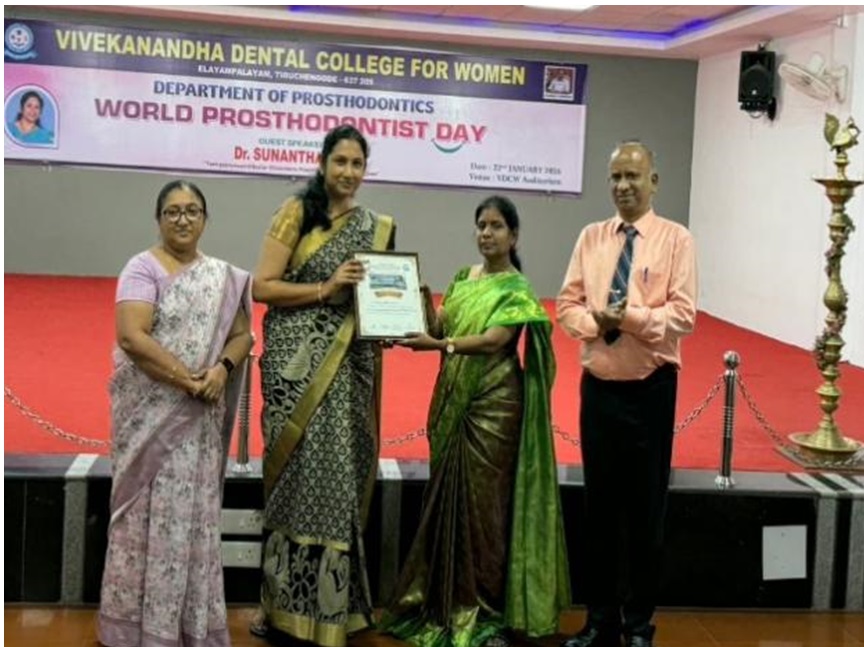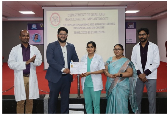 On World Prosthodontist Day, the Department of Prosthodontics conducted a CDE programme on January 22, 2026 titled “Temporomandibular Disorders – Prosthodontic Perspectives.” The resource person Dr. Sunantha S., Associate Professor, Vinayaka Mission’s Sankaracharyiar Dental College, Salem, gave her insights into TMD management and its impact on patient quality of life.
