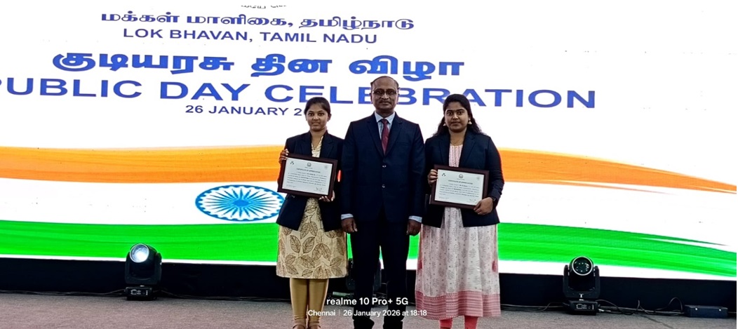 II BDS students Gokila and R. Sneha of VDCW were awarded a cash prize of ₹30,000 in a State-Level Essay Writing Competition conducted in commemoration with the birth anniversary celebration of Mahakavi Subramania Bharathiar. The prize was presented by the Honorable Governor of Tamil Nadu, Thiru R. N. Ravi, during the “At Home” celebration held at Lok Bhavan, Chennai, on the occasion of Republic Day 2026